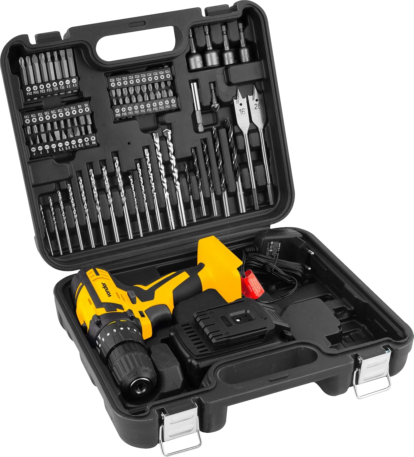 Acompanha 74 acessórios encaixados perfeitamente na maleta, conferindo organização, praticidade e maior vida útil dos acessórios Possui regulagem para 18 posições de torque e velocidade variável (2 velocidades) Contém 3 funções de operação: parafusadeira, furadeira sem impacto e furadeira com impacto Possui LED para melhor visibilidade do local de trabalho, indicador de carga da bateria, cabo com revestimento emborrachado proporcionando maior conforto ao operador, bateria de íons de lítio que confere alta eficiência de operação, além de fonte bivolt automática com tensão de entrada de 100 V~ - 240 V~
